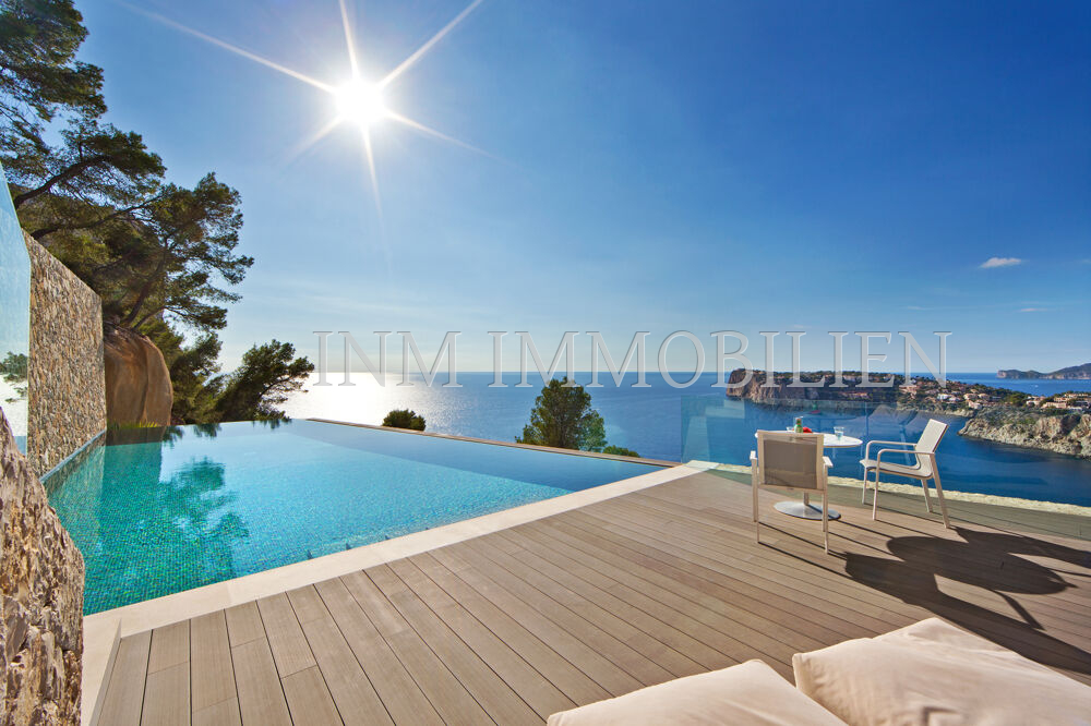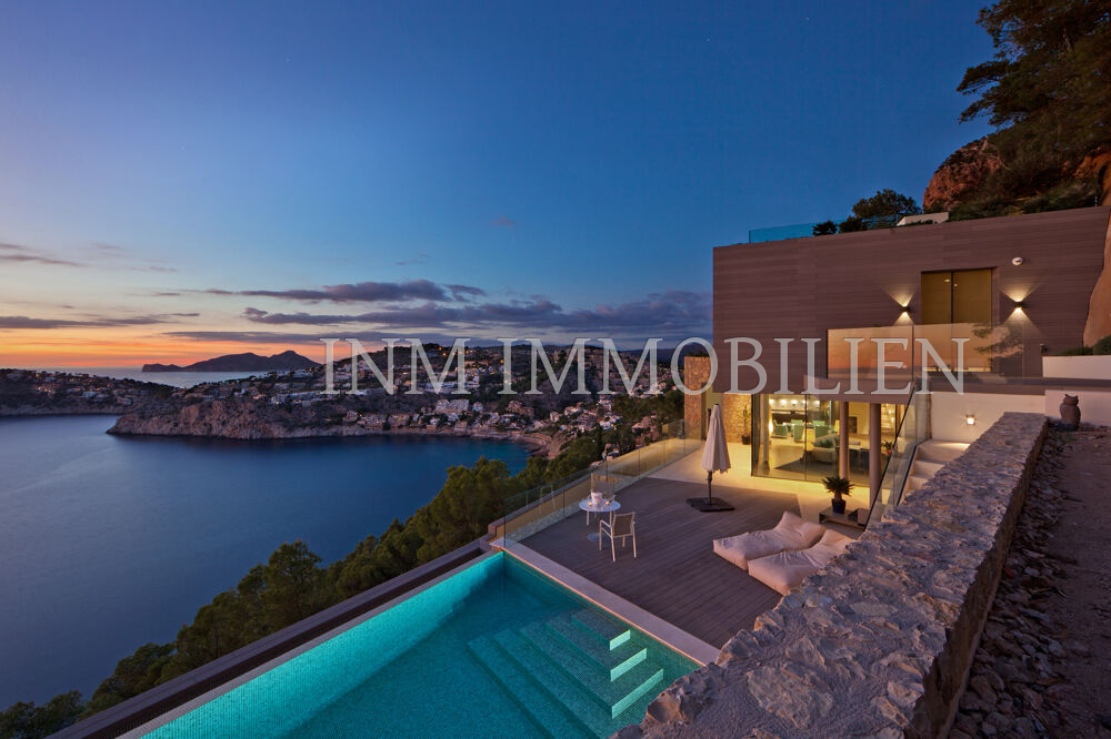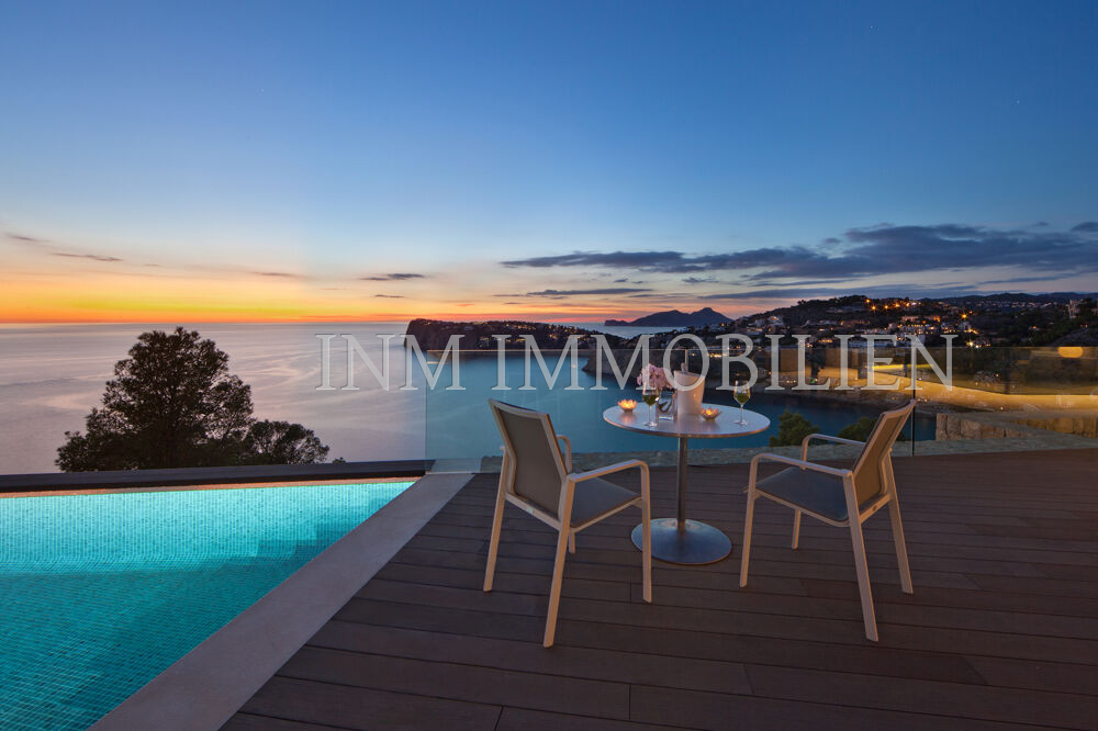 Auch im Außenbereich setzt die Villa beeindruckende Akzente. Der elegant gestaltete Infinity-Pool mit Wasserelektrolyse lädt zum Baden und Entspannen ein und fügt sich harmonisch in die Umgebung ein. Ergänzend stehen eine Außendusche sowie ein separates WC für den Pool- und Terrassenbereich zur Verfügung. Die großzügige Dachterrasse mit integriertem Grillbereich bietet einen traumhaften Platz für gesellige Abende, kulinarische Erlebnisse unter freiem Himmel oder den Genuss des Panoramablicks.