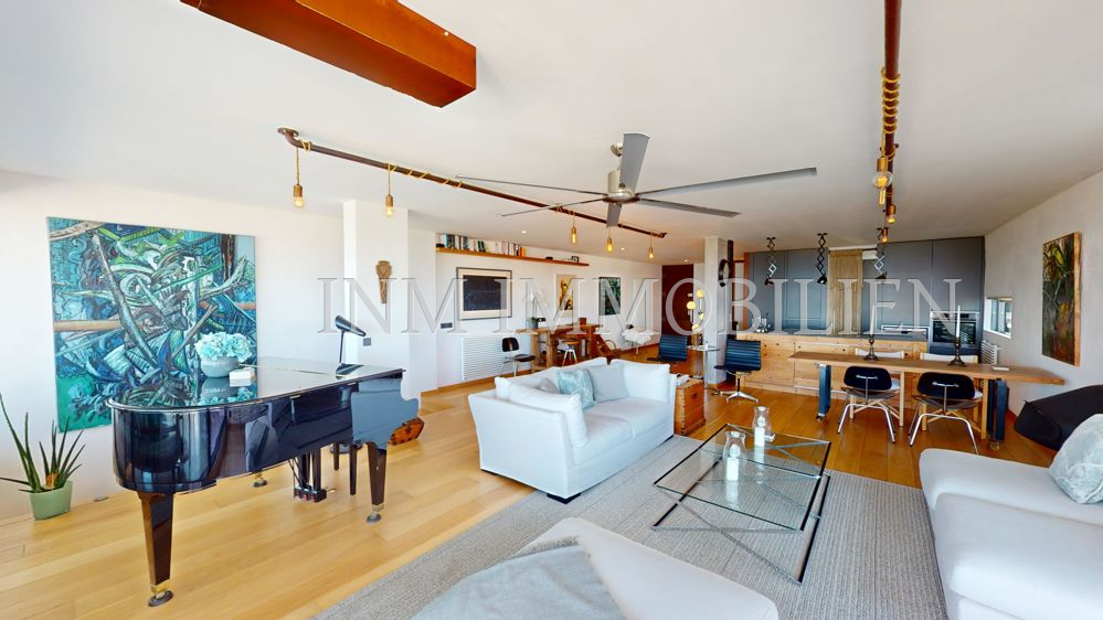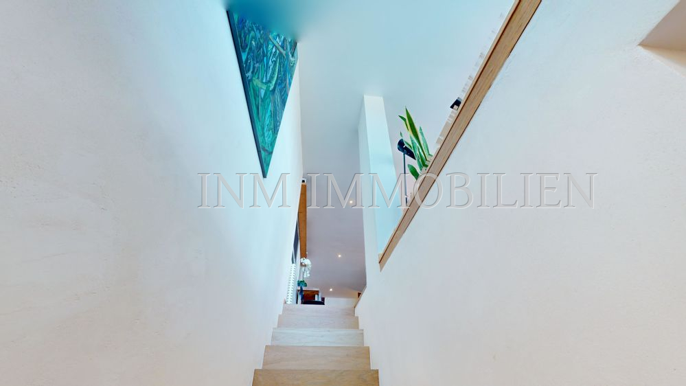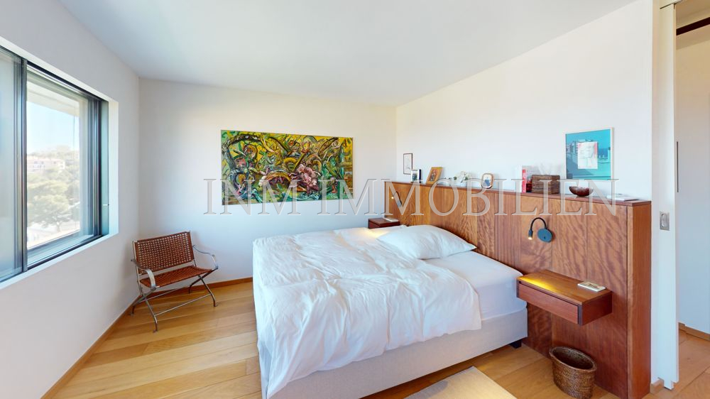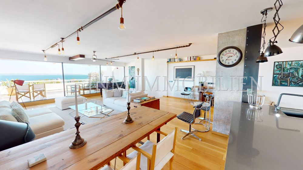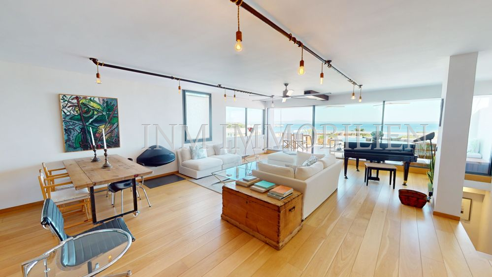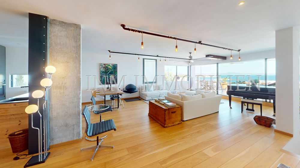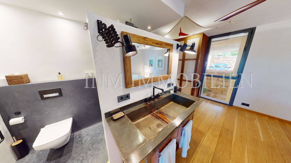 Wunderschönes, modernes Duplex in bester Lage im Südwesten der Insel. Dieses einzigartige Anwesen besticht durch einen großen, lichtdurchfluteten Wohnbereich mit einem herrlichen Blick aufs Meer. Für wohlige Wärme sorgt ein moderner Kamin mit Holz. Die moderne, voll ausgestattete, offene Küche ist in elegantem Anthrazit gehalten und bietet alle Annehmlichkeiten für kulinarische Genüsse. Der Wohnbereich verfügt über tolle, verschiedene Lichtelemente, die eine angenehme Atmosphäre schaffen. Der Parkettboden verleiht dem Raum ein edles Ambiente. Deckenventilatoren und Heizkörper sorgen in allen Räumen für angenehme Temperaturen zu jeder Jahreszeit. Das Schlafzimmer ist über eine stilvolle Treppe vom Wohnbereich aus erreichbar. Es verfügt über ein offenes Design mit einem eigenen Bad, einer Ankleide und Einbauschränken. In beiden Schlafzimmern ist eine Klimaanlage vorhanden, die für erholsamen Schlaf sorgt. Zur Wohnung gehört eine wunderschöne, ca. 44 qm2 große Terrasse mit Meerblick, auf der man die Sonne und den Ausblick genießen kann. Ein Hauswirtschaftsraum und ein Gäste-WC befinden sich auf derselben Ebene. Ein überdachter Stellplatz und ein Kelleranteil gehören ebenfalls zur Wohnung. Die Wohnfläche beträgt 146 m². Es gibt 2 Schlafzimmer und 2 Badezimmer. Das Objekt befindet sich in einem guten Zustand und bietet Einbauschränke, einen Abstellraum, eine Gästetoilette und eine Klimaanlage, sowie eine Zentralheizung mit Gas. Baujahr des Gebäudes ist 1988. Die Wohnung befindet sich im 1. Stock, und ist nach Osten und Südwesten ausgerichtet. Ein Stellplatz ist im Preis inbegriffen. Zur Anlage gehört außerdem ein Pool, der zum Entspannen und Abkühlen einlädt.