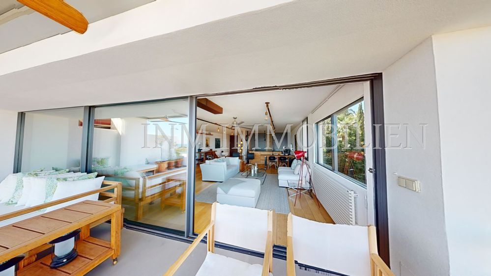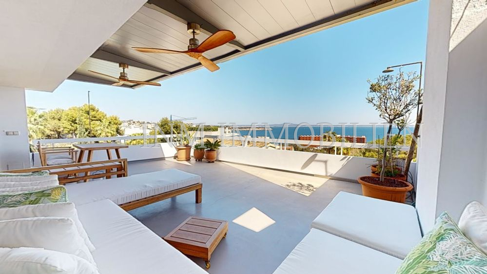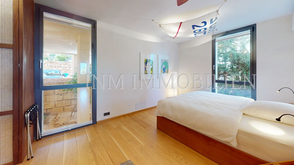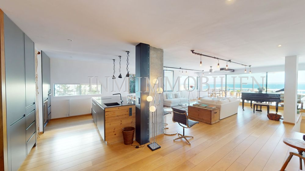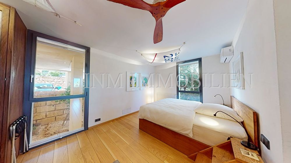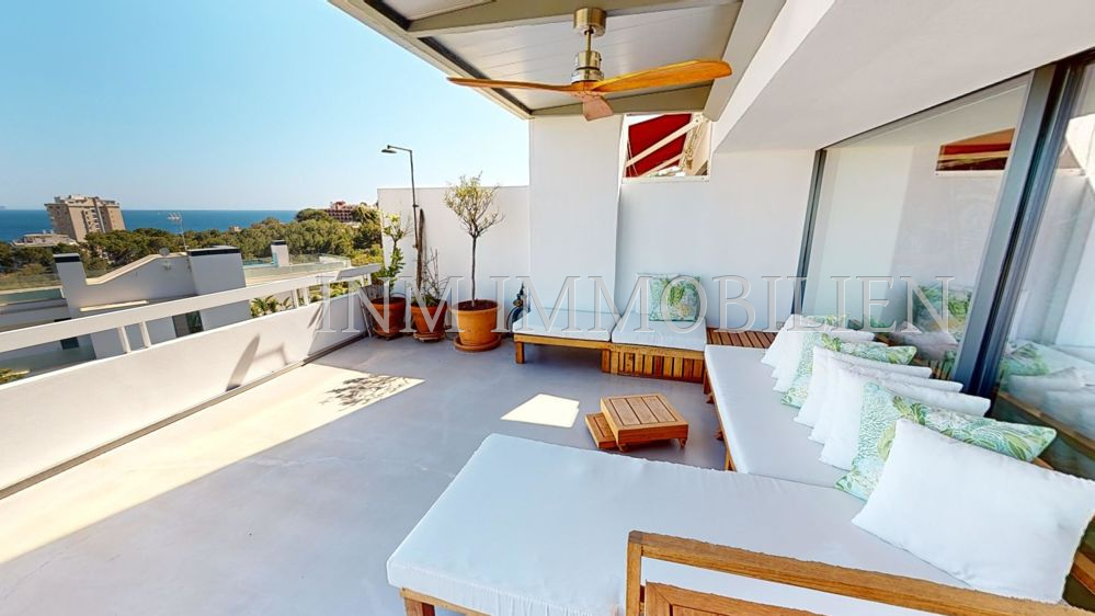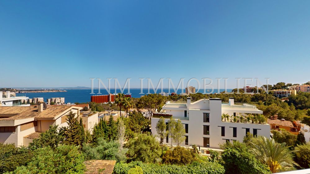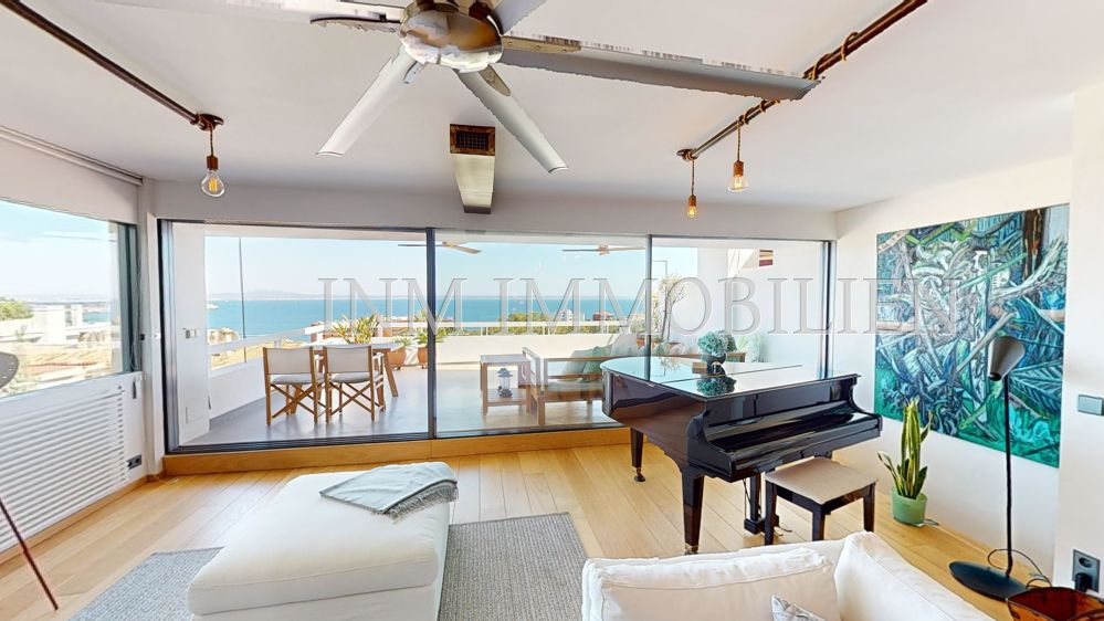 Wunderschönes, modernes Duplex in bester Lage im Südwesten der Insel. Dieses einzigartige Anwesen besticht durch einen großen, lichtdurchfluteten Wohnbereich mit einem herrlichen Blick aufs Meer. Für wohlige Wärme sorgt ein moderner Kamin mit Holz. Die moderne, voll ausgestattete, offene Küche ist in elegantem Anthrazit gehalten und bietet alle Annehmlichkeiten für kulinarische Genüsse. Der Wohnbereich verfügt über tolle, verschiedene Lichtelemente, die eine angenehme Atmosphäre schaffen. Der Parkettboden verleiht dem Raum ein edles Ambiente. Deckenventilatoren und Heizkörper sorgen in allen Räumen für angenehme Temperaturen zu jeder Jahreszeit. Das Schlafzimmer ist über eine stilvolle Treppe vom Wohnbereich aus erreichbar. Es verfügt über ein offenes Design mit einem eigenen Bad, einer Ankleide und Einbauschränken. In beiden Schlafzimmern ist eine Klimaanlage vorhanden, die für erholsamen Schlaf sorgt. Zur Wohnung gehört eine wunderschöne, ca. 44 qm2 große Terrasse mit Meerblick, auf der man die Sonne und den Ausblick genießen kann. Ein Hauswirtschaftsraum und ein Gäste-WC befinden sich auf derselben Ebene. Ein überdachter Stellplatz und ein Kelleranteil gehören ebenfalls zur Wohnung. Die Wohnfläche beträgt 146 m². Es gibt 2 Schlafzimmer und 2 Badezimmer. Das Objekt befindet sich in einem guten Zustand und bietet Einbauschränke, einen Abstellraum, eine Gästetoilette und eine Klimaanlage, sowie eine Zentralheizung mit Gas. Baujahr des Gebäudes ist 1988. Die Wohnung befindet sich im 1. Stock, und ist nach Osten und Südwesten ausgerichtet. Ein Stellplatz ist im Preis inbegriffen. Zur Anlage gehört außerdem ein Pool, der zum Entspannen und Abkühlen einlädt.